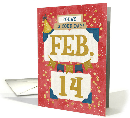 | Artist Notes: | Give happy birthday greetings with the recipient's birth month and day boldly displayed on the front. This design features a party hat, a festive banner and a background of stars. This scrapbook style looking card is suitable for anyone with a birth date of February 14th. TOP TEXT HAS AN INTENTIONAL DISTRESSED LOOK, THIS SHOULD NOT BE MISCONSTRUED AS A PRINTING ERROR. THE DESCRIPTION OF GOLD MEANS THE COLOR GOLD, NOT AN ACTUAL METALLIC 3D ELEMENT. |