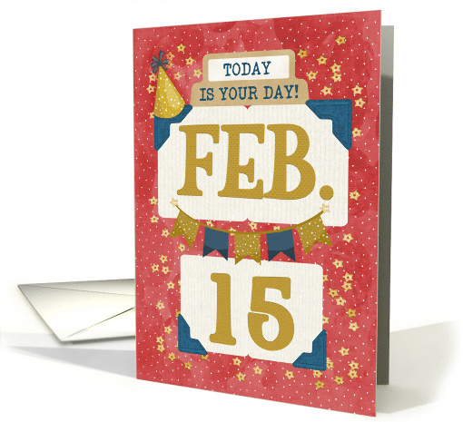 | Artist Notes: | Give happy birthday greetings with the recipient's birth month and day boldly displayed on the front. This design features a party hat, a festive banner and a background of stars. This scrapbook style looking card is suitable for anyone with a birth date of February 15th. TOP TEXT HAS AN INTENTIONAL DISTRESSED LOOK, THIS SHOULD NOT BE MISCONSTRUED AS A PRINTING ERROR. THE DESCRIPTION OF GOLD MEANS THE COLOR GOLD, NOT AN ACTUAL METALLIC 3D ELEMENT. |