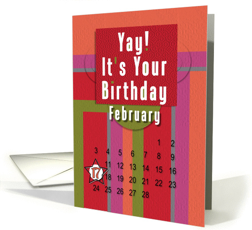 | Artist Notes: | Make the February 17th birthday person on your list feel extra special with this fun,cheerful Mardi Gras inspired colors card that has a February calendar with their special day denoted with a star. Original digital art design by Betsy Bush of Birthday Cards Cafe'. |