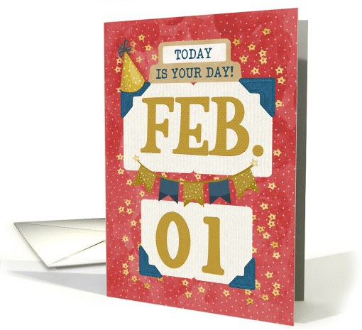 | Artist Notes: | Give happy birthday greetings with the recipient's birth month and day boldly displayed on the front. This design features a party hat, a festive banner and a background of stars. This scrapbook style looking card is suitable for anyone with a birth date of February 1st. TOP TEXT HAS AN INTENTIONAL DISTRESSED LOOK, THIS SHOULD NOT BE MISCONSTRUED AS A PRINTING ERROR. THE DESCRIPTION OF GOLD MEANS THE COLOR GOLD, NOT AN ACTUAL METALLIC 3D ELEMENT. |