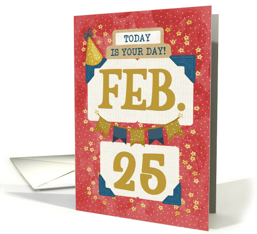 | Artist Notes: | Give happy birthday greetings with the recipient's birth month and day boldly displayed on the front. This design features a party hat, a festive banner and a background of stars. This scrapbook style looking card is suitable for anyone with a birth date of February 25th. TOP TEXT HAS AN INTENTIONAL DISTRESSED LOOK, THIS SHOULD NOT BE MISCONSTRUED AS A PRINTING ERROR. THE DESCRIPTION OF GOLD MEANS THE COLOR GOLD, NOT AN ACTUAL METALLIC 3D ELEMENT. |