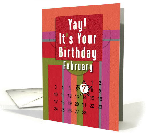 | Artist Notes: | Make the February 7th birthday person on your list feel extra special with this fun,cheerful Mardi Gras inspired colors card that has a February calendar with their special day denoted with a star. Original digital art design by Betsy Bush of Birthday Cards Cafe'. |
