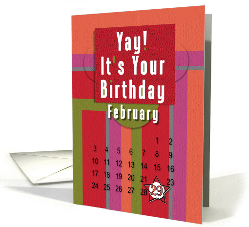 | Artist Notes: | Make the February 29th Leap Year birthday person on your list feel extra special with this fun,cheerful Mardi Gras inspired colors card that has a February calendar with their special day denoted with a star. Original digital art design by Betsy Bush of Birthday Cards Cafe'. |