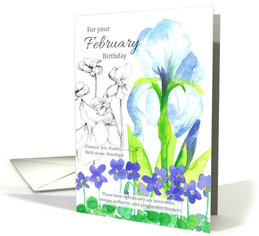 | Artist Notes: | For someone special with a birthday in February featuring the birth month flowers of iris and violets illustrated with pencil and painted with watercolor in shades of wintery blue and purple. The birth flowers, birthstone, and a few personality traits accent the design. |