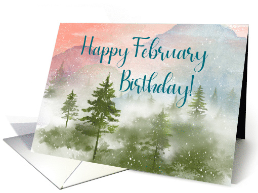 | Artist Notes: | February birthday recipients will smile when they receive this beautiful watercolor snowy landscape card. Soft colors blend together to create a wintry scene of trees nestled at the foot of mountains. The greeting reads "Happy February Birthday!" |