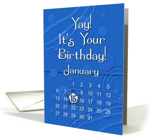 Make the January 15th birthday person on your list feel extra special with this fun,cheerful blue and white card that has a January calendar with their special day denoted with a star. Original digital art design by Betsy Bush of Birthday Cards Cafe'.