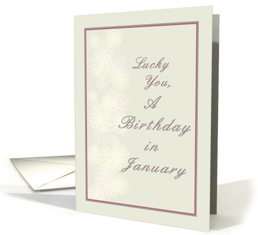 Birthday card for January for male or female in a light green, cranberry and grey writing and snowflakes. You are welcome to change the wording on the inside of the card and if you should purchase it, thanks so much. Snowflake photoshop brush designed by Heygrey.