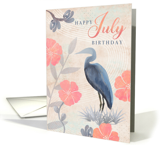 Celebrate the warmth of summer with nature-inspired card for someone with a July birthday featuring pink flowers and a blue hand drawn heron in a collage style.