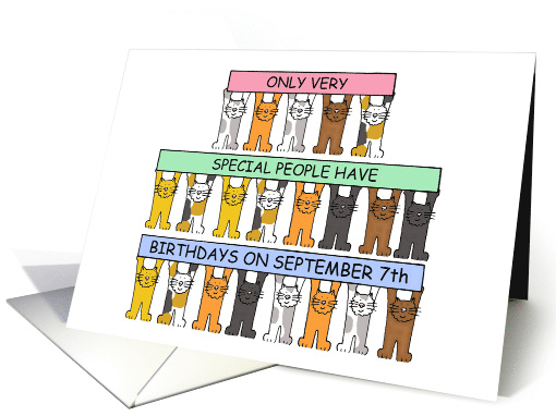 | Artist Notes: | A great card for any cat lover born on September 7th. Cats of a variety of colors, holding up pastel pink, blue and green, long banners above their heads. The banners have a birthday greeting written on them for any special person born on this date in the month of September. |
