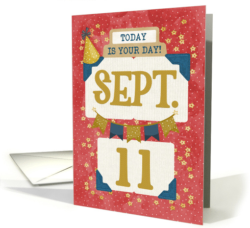 | Artist Notes: | Give happy birthday greetings with the recipient's birth month and day boldly displayed on the front. This design features a party hat, a festive banner and a background of stars. This scrapbook style looking card is suitable for anyone with a birth date of September 11th. TOP TEXT HAS AN INTENTIONAL DISTRESSED LOOK, THIS SHOULD NOT BE MISCONSTRUED AS A PRINTING ERROR. THE DESCRIPTION OF GOLD MEANS THE COLOR GOLD, NOT AN ACTUAL METALLIC 3D ELEMENT. |