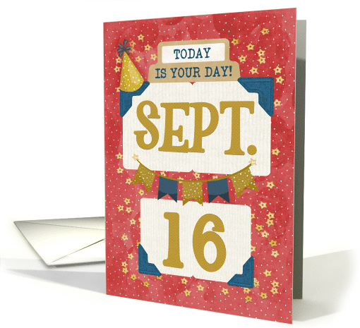 | Artist Notes: | Give happy birthday greetings with the recipient's birth month and day boldly displayed on the front. This design features a party hat, a festive banner and a background of stars. This scrapbook style looking card is suitable for anyone with a birth date of September 16th. TOP TEXT HAS AN INTENTIONAL DISTRESSED LOOK, THIS SHOULD NOT BE MISCONSTRUED AS A PRINTING ERROR. THE DESCRIPTION OF GOLD MEANS THE COLOR GOLD, NOT AN ACTUAL METALLIC 3D ELEMENT. |