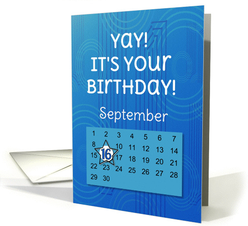| Artist Notes: | Make the September 16th birthday person on your list feel extra special with this fun cheerful blue card that has a September calendar with their special day denoted with a star. Original digital art design by Betsy Bush of Birthday Cards Cafe'. |