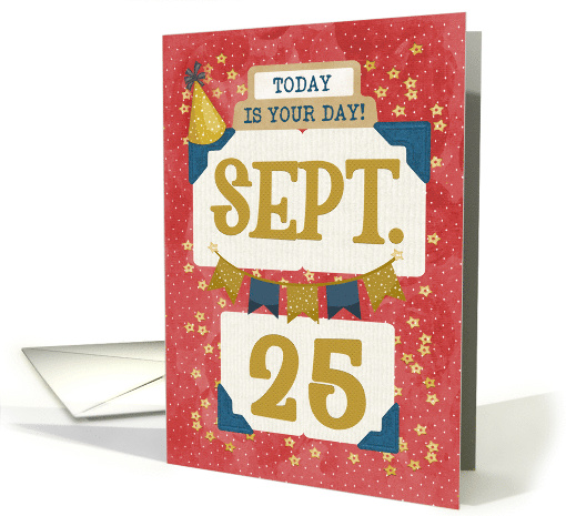 | Artist Notes: | Give happy birthday greetings with the recipient's birth month and day boldly displayed on the front. This design features a party hat, a festive banner and a background of stars. This scrapbook style looking card is suitable for anyone with a birth date of September 25th. TOP TEXT HAS AN INTENTIONAL DISTRESSED LOOK, THIS SHOULD NOT BE MISCONSTRUED AS A PRINTING ERROR. THE DESCRIPTION OF GOLD MEANS THE COLOR GOLD, NOT AN ACTUAL METALLIC 3D ELEMENT. |