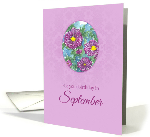 | Artist Notes: | For the month of September pretty birthday greetings featuring royal purple aster flowers on a soft lilac background with lace effects. Design and illustration by Cathie Richardson. |