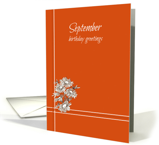 | Artist Notes: | September birthday greetings featuring a sprig of aster flowers drawn in sepia pen and ink on a cayenne red background accented with vertical and horizontal stripes. Design and illustration by Cathie Richardson. |