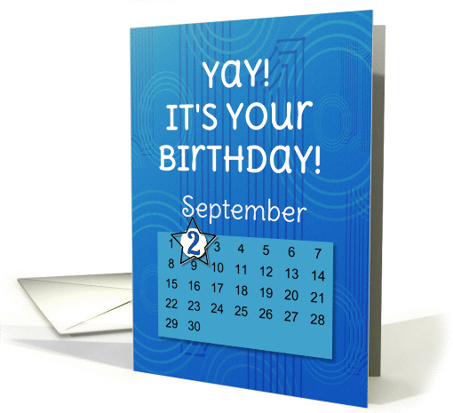 | Artist Notes: | Make the September 2nd birthday person on your list feel extra special with this fun cheerful blue card that has a September calendar with their special day denoted with a star. Original digital art design by Betsy Bush of Birthday Cards Cafe'. |
