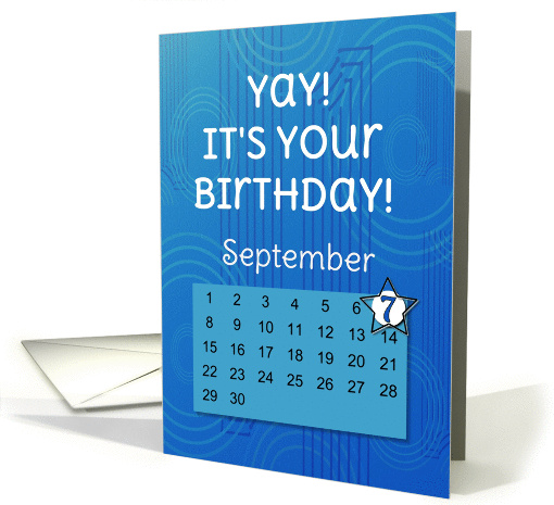 | Artist Notes: | Make the September 7th birthday person on your list feel extra special with this fun cheerful blue card that has a September calendar with their special day denoted with a star. Original digital art design by Betsy Bush of Birthday Cards Cafe'. |