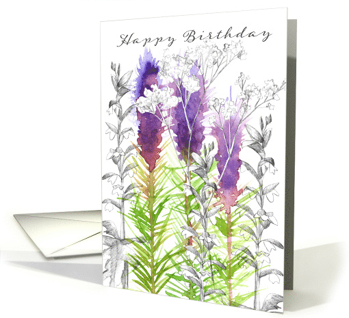 Happy birthday greeting card with a floral botanical theme with wildflowers painted in shades of purple and white flowers drawn with pencil mingling with each other in a summer wildflower garden.