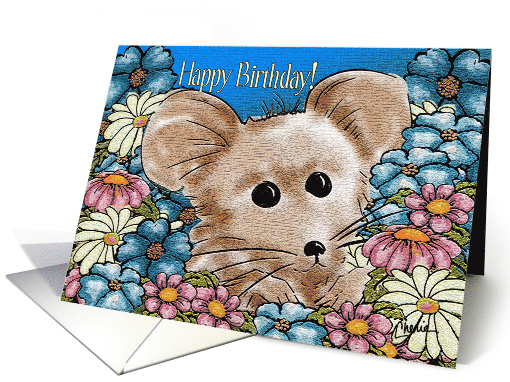 An adorable brown mouse amongst the pink, blue and white flowers makes this birthday greeting card so cute! Look at those big dark eyes! For a child or for anyone who loves little critters and pretty flowers, this will be a delight to receive.