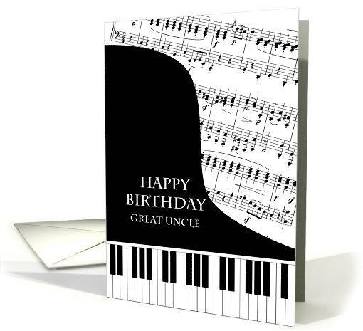| Artist Notes: | A birthday card for a great uncle who is into piano music. A grand piano with the keys along the bottom of the card. A sheet of music fills the background. A great card for somone who loves music. This is NOT a musical card, it does NOT play music: |