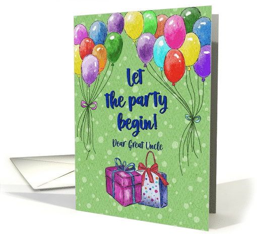 | Artist Notes: | A cheerful birthday card with a green background covered in soft polka dots. At the top, a cluster of colorful watercolor balloons tied with bows floats above the bold hand-lettered phrase “Let the party begin!” in vibrant blue. At the bottom, two gift boxes — one in bright pink with a blue ribbon and another polka-dotted with a red bow — complete the festive composition. A fun and joyful design for any celebration. Great Uncle |