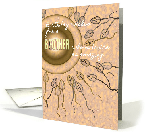 | Artist Notes: | Birthday for a half brother who shares the same sperm donor dad. This illustration shows sperm at the point of contact with an egg. The sperm are tagged with 'our sperm donor dad'. The background is a swirling pattern in shades of pink and brown. The word 'HALF' is written vertically within the letter 'R' in 'BROTHER'. |