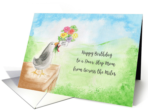 Wish a dear step mom a happy birthday from across the miles with this bright cheerful greeting card showing a gray bird with a bouquet of flowers in its beak against a sunny spring background.