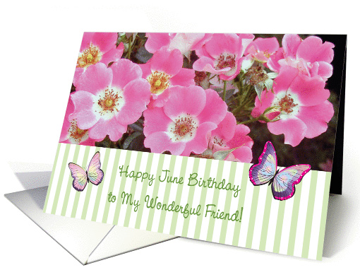 This is a birthday card for a friend who has a June birthday, featuring my photo of old fashioned pink roses, light green stripes, and 2 butterflies. You may change the inside message at check out, if you wish.