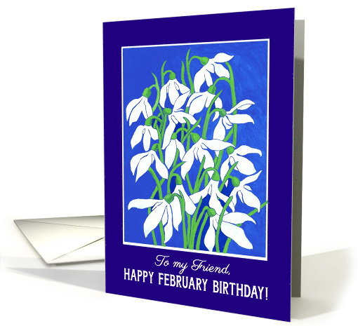 A pretty Birthday Card for a friend, with a bunch of snowdrops on a deep blue background, surrounded by a navy blue border, from a watercolour painting by Judy Adamson. The front cover greeting, in white lettering on the navy border, is, 'To my Friend, HAPPY FEBRUARY BIRTHDAY!' and you can change or delete the inside message if you wish.