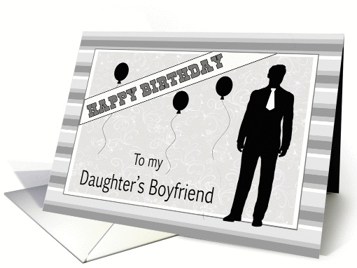 Artist Notes: | A contemporary masculine Birthday Card for your daughter's boyfriend, that features a stripped grey background, a male silhouette and balloon silhouettes plus the words "Happy Birthday" and "to Daughter's Boyfriend." Greeting Cardİ2015 Kreative Sentiments Cards by Sherry Harris |