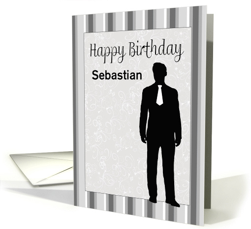 Artist Notes: | A Custom Name Birthday Card for your daughter's boyfriend, that features a striped grey background, a male silhouette plus the words "Happy Birthday." Add his name to personalize the card. Greeting Cardİ2015 Kreative Sentiments Cards by Sherry Harris |