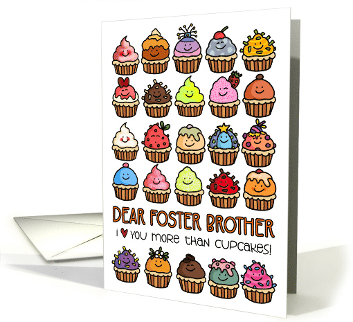 | Artist Notes: | A whole bunch of cute smiling cartoon cupcakes on a white background with the text "Dear Foster Brother I love you more than Cupcakes!" A super sweet design to send to your foster brother on their special day. |