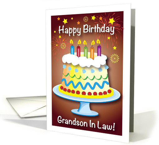 Do you want to stand out in the crowd? Then give this birthday card for that special grandson in law, featuring a colorful cake, blue plate, five lit candles, stars, and fireworks on a brown background. The cover text is white. You may change the inside message at check out, if you wish. Also, you can change the inside text in type style and color, to suit you. This card will surely be a hit with your Grandson In Law, because it can't be purchased in a retail store! It will be one of a kind and one your Grandson In Law will keep as a remembrance of his birthday. ©Gail Pepin