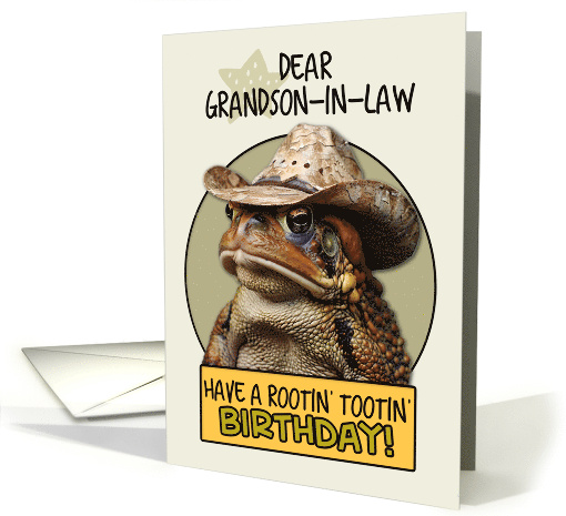 A hilarious toad wearing a cowboy hat on a soft green background with the text "dear grandson-in-law have a rootin' tootin' birthday! A fun birthday card with a country twist to send to your wonderful grandson in law for their special day