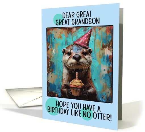 This delightful birthday card features a whimsical illustration of an adorable otter wearing a festive party hat and holding a delicious cupcake. The otter's fur is rendered with impressive detail, capturing its fuzzy texture and expressive eyes. The background is a vibrant, abstract swirl of blues, oranges, and browns, creating an underwater-like atmosphere filled with bubbles and splashes. The pun at the bottom, "Hope you have a birthday like no otter!" adds a playful, humorous touch that perfectly complements the charming otter illustration. A fun card to send to your wonderful great great grandson