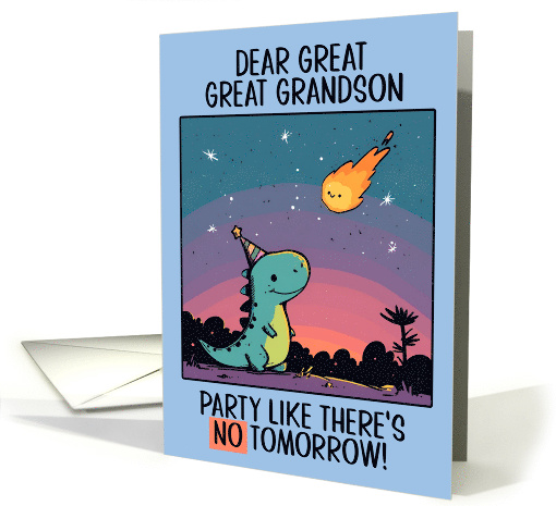 | Artist Notes: | A cute prehistoric cartoon dinosaur wearing a birthday hat - in a clean kawaii style with bold black outlines - is watching a burning comet come closer (and we all know what happened to the dinosaurs back then) in the night sky and the text "dear great great grandson party like there's no tomorrow!" A fun card to send to your wonderful great great grandson for their special day. |
