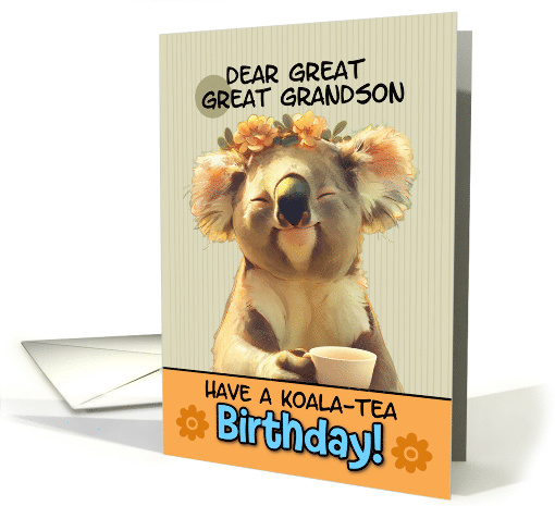 This birthday card features an adorable and whimsical illustration of a koala. The koala is depicted with a content, smiling expression and closed eyes, suggesting a state of blissful relaxation. It's wearing a delicate floral crown of small yellow-orange flowers, adding a touch of cheerfulness to its appearance. The koala is holding a white tea cup, which ties into the pun in the card's message. The background is a soft, striped pattern in a light beige color, giving the card a gentle, warm feel. At the bottom of the image is an orange banner containing the text "HAVE A KOALA-TEA Birthday!" This clever pun combines "koala" with "quality" to create a playful, tea-themed birthday wish.