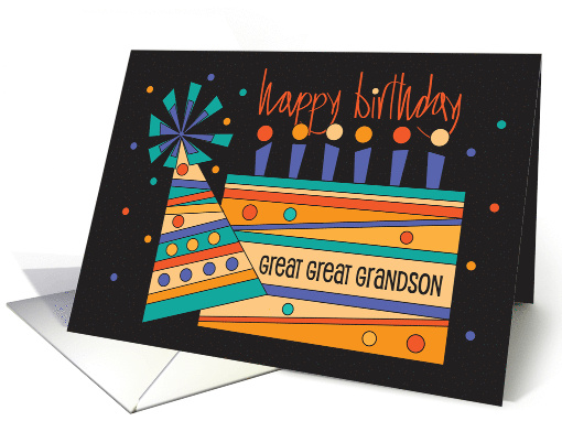 This joyful and brightly colored birthday card for your Great Great Grandson has a birthday cake, party hat and hand lettered wording that is sure to add to his birthday celebration this year. The large orange, deep lavender blue and bright teal green cake fills the card with its stripes and polka dots of celebration, with a matching party hat, angled in for the festivity. Right above the cake's row of candles, the card has orange hand lettered wording of "Happy Birthday", crossing the card, with the words "Great Great Grandson" appearing on the cake. The card's inside wording says "Happy Birthday, with love, to a very special Great Great Grandson! Hope you enjoy your day!"