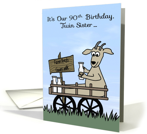 90th Birthday to Twin Sister Humor with a Goat in Cart Selling Milk