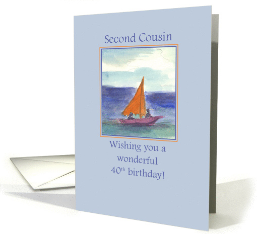 | Artist Notes: | A happy 40th birthday second cousin decorated with a orange sailboat painted in watercolor on a soft blue background. You can change the inside message to fit your needs. |