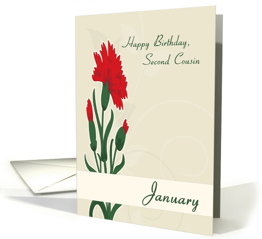 Artist Notes: | Give your second cousin this elegant January’s birth flower birthday card. Red carnations with swirls in the background make a perfect card for their special occasion. Design © 2015 Julia Bryant. |