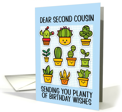 | Artist Notes: | A whole bunch of kawaii cactus and succulent plants in pots on a light blue background with the text "dear second cousinl sending you planty of birthday wishes". A wonderful birthday card to send to your plant loving second cousin |