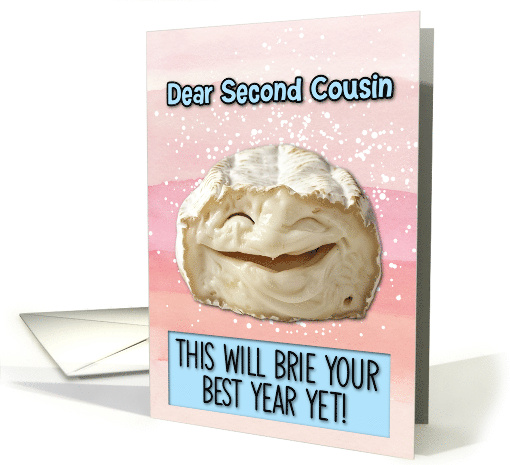 | Artist Notes: | A cute laughing brie cheese on a multiple shades of pink watercolor background with a white splatter grunge effect and the text "Dear second cousin this will brie your best year yet!!" in a light-blue box. A fun design for your wonderful second cousin for their birthday. |