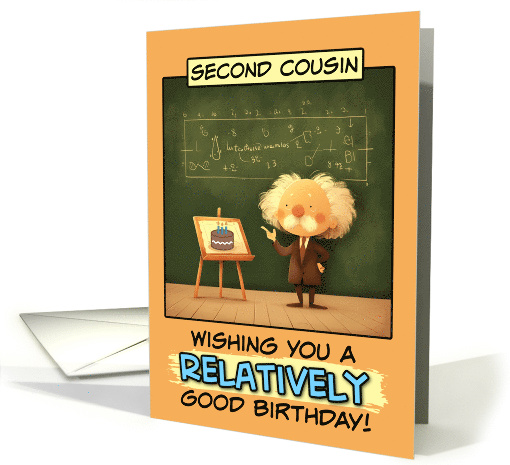This birthday greeting card humorously depicts a famous scientist standing in front of a chalkboard filled with complex equations and calculations. In front of him is an easel displaying a simple illustration of a birthday cake with candles. The text "Wishing you a RELATIVELY good birthday!" plays on the scientific connotations, creating a clever pun referencing both the theory of relativity in physics and wishing someone a "relatively" or moderately good birthday. This quirky, science/math-themed birthday card would likely appeal to someone with an interest or career in fields like physics, mathematics, engineering, or academia more broadly. It pokes gentle fun at the complexities of intellectual subjects while still celebrating the birthday humorously. So it would suit someone who doesn't take themselves too seriously despite their academic/technical leanings and can appreciate the lighthearted, punny twist on a birthday message, like your wonderful second cousin!