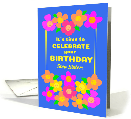 | Title: | For Step Sister Birthday With Fun Bright Smiley Flowers on Blue |