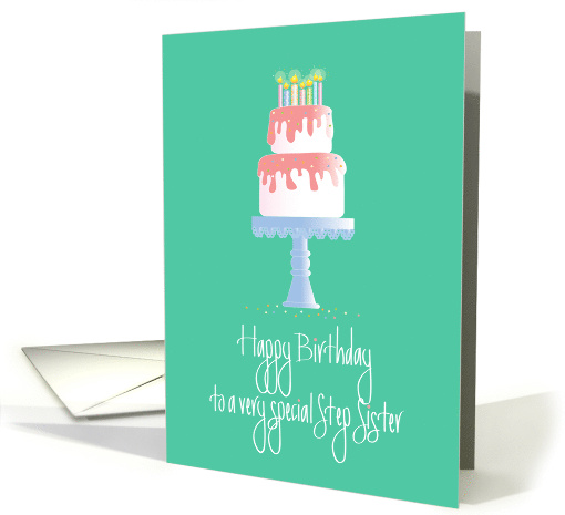 It's almost impossible to find just the right lovely birthday card for your Step Sister, yet this very special card is one that you will love, for any age sister. It features a central layered cake, dripping with pink and white frosting, topped with colorful, patterned candles awaiting her birthday wish and footed with a lovely blue cake platter with a pedestal. The card's message, in lovely, white hand lettering is "Happy Birthday to a very special Step Sister". The inside birthday wording to her is "Wishing you a wonderfully happy day, where all your wishes come true!"