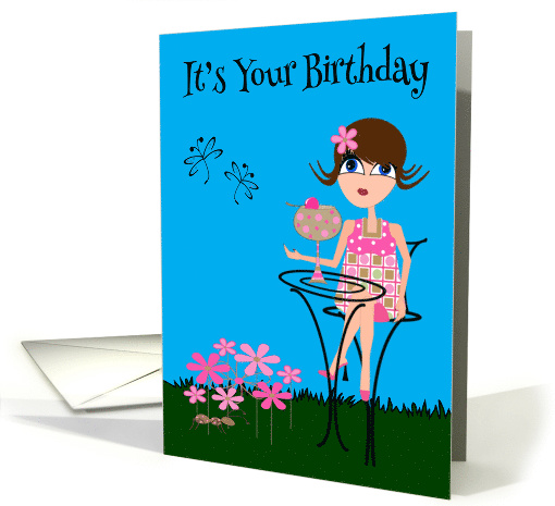 Wish a female in your life a Happy Birthday with a humorous card featuring a woman with a pink flower in her hair getting ready to enjoy a large cocktail at an outside table sitting in the grass. The background has pink flowers and an ant in the grass against a pretty blue sky with black text. Inside like all Greeting Card Universe cards can be personalized by you if you wish to give it your own personal touch. Design by Laurie Schneider, elements by J. Rett Graphics