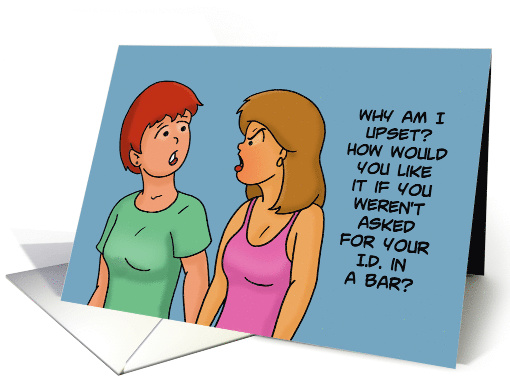 Birthday card for her with a cartoon showing two young women. One is angry and says: Why am I upset? How would you like it if you weren't asked for your ID in a bar? Inside says: Welcome to adulthood! Happy Birthday