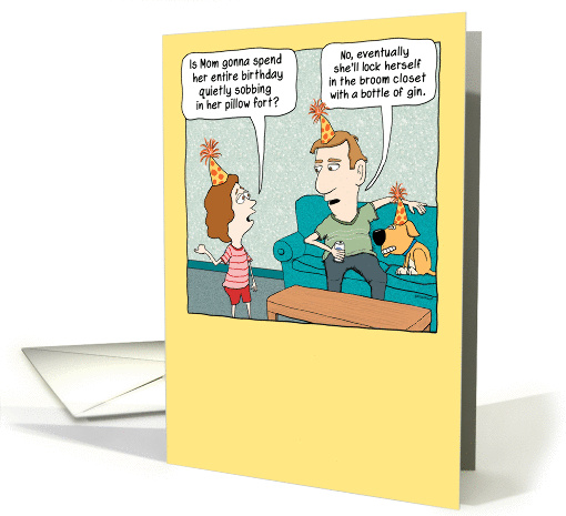 This funny birthday card features family members who wonder if Mom will ever come out of her pillow fort on her birthday. Copyright Chuck Ingwersen 2015.