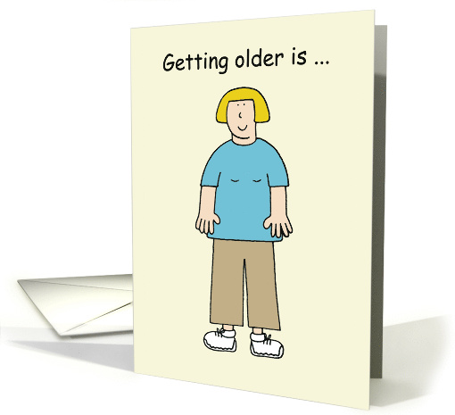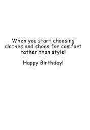 Colorful cartoon of a lady wearing very 'comfortable' clothes and trainers. The card says 'Getting older is...' and inside, the card says:-' When you start choosing clothes and shoes for comfort rather than style'. 'Happy Birthday!' A great card that a lot of older ladies can relate too, comfort over fashion!